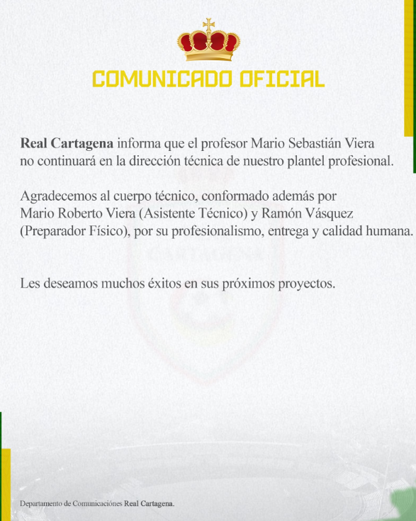 Oficial: Sebastián Viera no va más como técnico del Real Cartagena