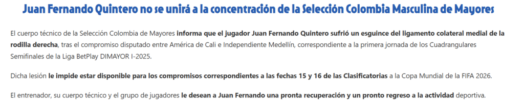 Al minuto 81, Juan Fernando Quintero, fue sustituido en el América de Cali vs Deportivo Independiente Medellín. Una distención en su ligamento medial de la rodilla derecha, lo apartará de una nueva doble fecha de Eliminatorias Sudamericanas.
