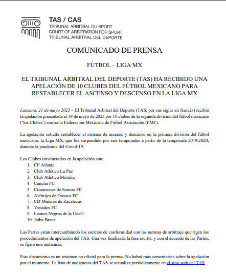 Diez clubes de la Liga de Expansión MX han elevado su voz de forma oficial en busca de justicia deportiva. El pasado 19 de mayo de 2025, presentaron una apelación ante el Tribunal Arbitral del Deporte (TAS) con el objetivo de restablecer el sistema de ascenso y descenso en la Liga MX, el cual fue suspendido en 2020 en medio de la crisis sanitaria causada por la pandemia de Covid 19.