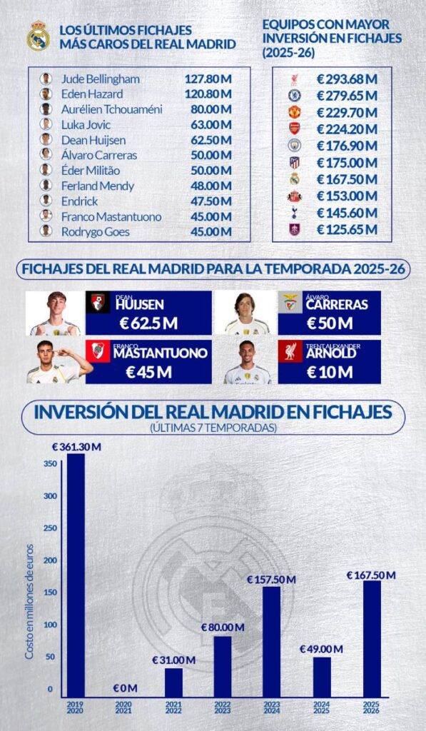 Para la temporada 2025-26, el Real Madrid regresó a la lista de los 10 equipos que más dinero han derrochado para reforzarse. Si bien no trajeron a un bombazo, apostaron con grandes cantidades de dinero a jóvenes con un futuro prometedor, como es el caso de Dean Huijsen, Álvaro Carreras y Franco Mastantuono, gastando la importante suma de 167.50 millones de euros.