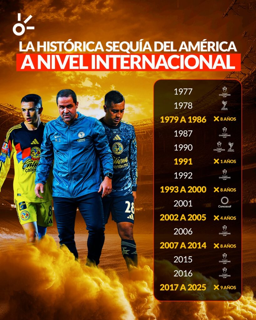 En tres ocasiones hubo 8 años de sequía internacional para el América. Luego de ganar la Copa Interamericana en 1978, con el golazo de Carlos Reinoso al minuto 119 ante Boca Juniors, fueron 8 temporadas sin título (1979 a 1986), que se repitió de 1993 a 2000 y de 2007 a 2014. Tras ello, el América logró un bicampeonato de la Concachampions en 2015 y 2016.
