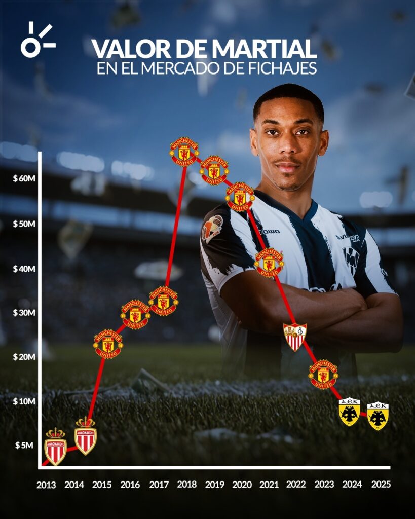 Ese gran momento lo llevó a fichar por el Manchester United en 2015, a cambio de 60 millones de euros, una cifra récord para un jugador adolescente en su momento. La confianza en él era tan alta que el club incluyó una cláusula de Balón de Oro en su contrato, que hubiera dado 7.2 millones de euros extra al Mónaco en caso de cumplirse. Sin embargo, el galardón nunca llegó, y poco a poco Martial se fue devaluando.