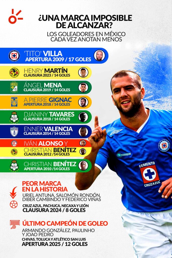 Desde hace 16 años, ningún jugador ha alcanzado la cifra de 15 goles o más para llevarse el título. La última vez que esto ocurrió fue en el Apertura 2009, cuando Emanuel ‘Tito’ Villa marcó 17 tantos con Cruz Azul, liderando a su equipo hasta la final del torneo.