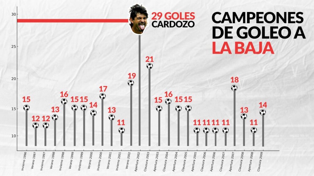 Con la instauración de los torneos cortos en 1996, los campeones de goleo solían superar la barrera de los 15 tantos. Entre 1996 y 2005, esa cifra fue una constante, con seis campeonatos definidos por goleadores que, al menos, alcanzaron esa marca.
