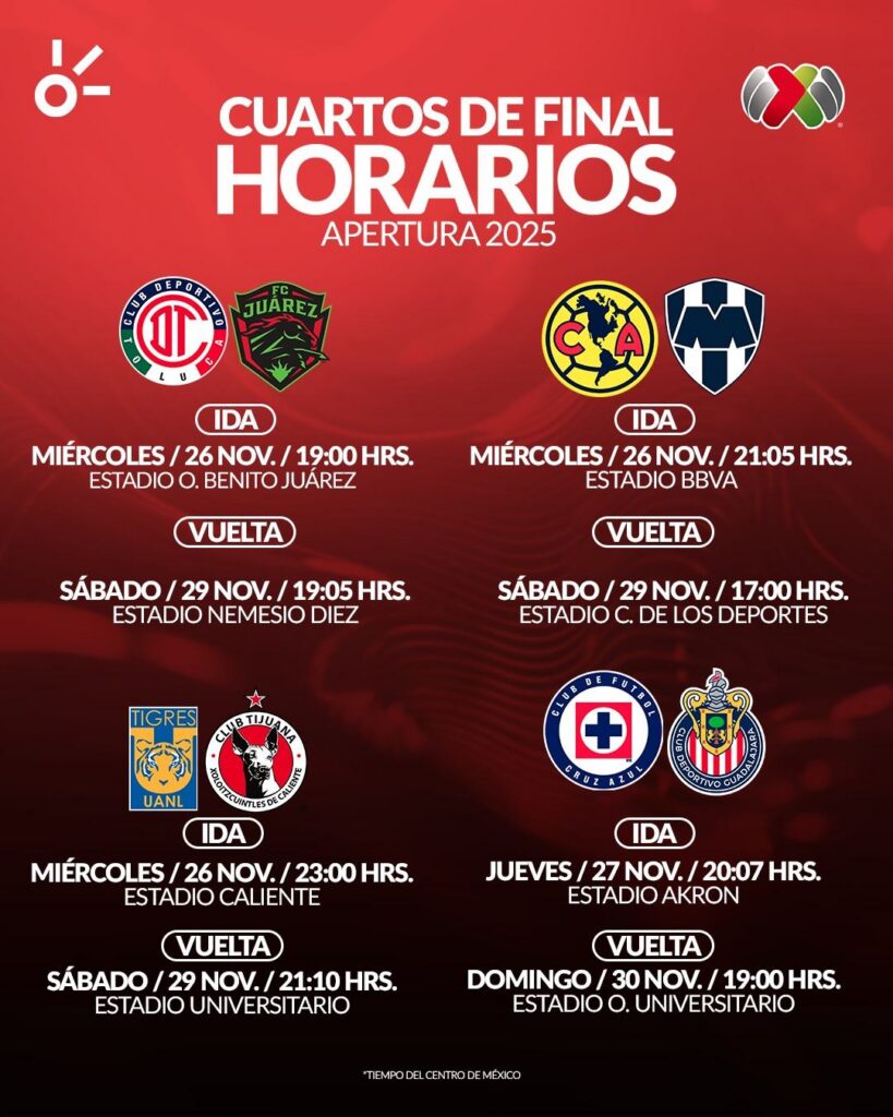 La Liga MX confirmó las fechas y horarios para los cuartos de final del Apertura 2025. Tras el Play In, donde Tijuana y Juárez aseguraron los últimos boletos, quedaron definidos los cruces para la primera ronda de la Fiesta Grande, donde Toluca parte como favorito para conquistar el bicampeonato, luego de asegurar el liderato en la fase regular. Para esta edición, la Liguilla presenta una situación inédita. Tres partidos de cuartos de final se jugarán en miércoles y sábado, mientras que solo uno se disputará en jueves y domingo. Está decisión se tomó con base en una petición de la Secretaría de Seguridad Ciudadana de la Ciudad de México.