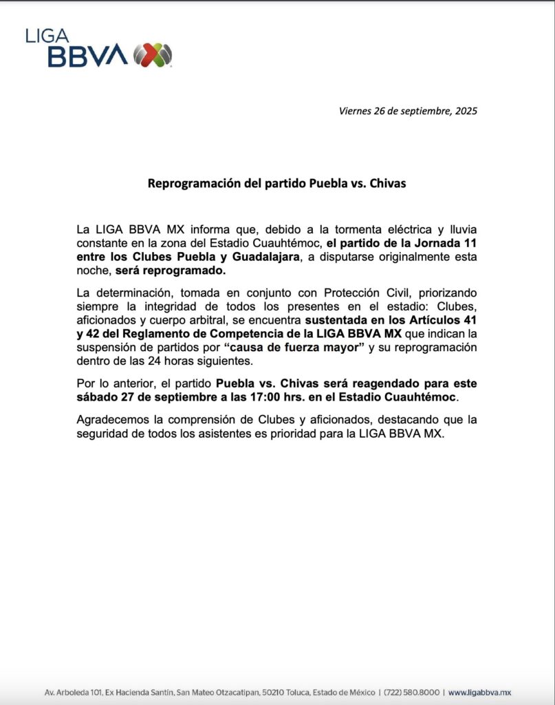 En un inicio la Liga MX emitió un comunicado en el que informó que la determinación del arranque se tomaría en conjunto con las autoridades correspondientes y en seguimiento a los protocolos de seguridad establecidos para partidos de alto riesgo por tormentas eléctricas. Al no haber mejoría en el clima y con la cancha muy maltratada, se terminó por lanzar otra misiva para anunciar la reprogramación del juego.