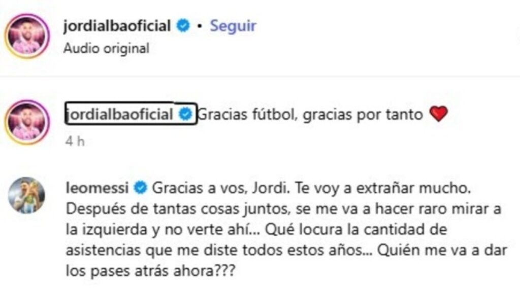 Mientras se encuentra concentrado con Argentina para los amistosos en Estados Unidos, Messi publicó en Instagram unas palabras cargadas de nostalgia: “Gracias a vos, Jordi. Te voy a extrañar mucho. Después de tantas cosas juntos, se me va a hacer raro mirar a la izquierda y no verte ahí… Qué locura la cantidad de asistencias que me diste todos estos años… ¿Quién me va a dar los pases atrás ahora?”. El mensaje se viralizó en cuestión de minutos, con miles de reacciones de aficionados y compañeros.