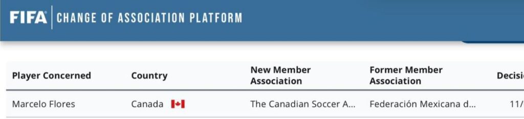 La FIFA autorizó el cambio de federación de Marcelo Flores, por lo que el futbolista de Tigres ya es oficialmente elegible para representar a la selección de Canadá. Con esta resolución, el atacante deja de estar disponible para la selección mexicana en cualquier competencia internacional.