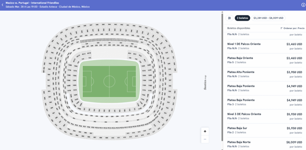 Una de ellas es Hello Tickets, que el jueves por la noche tenía boletos en varias secciones del Coloso de Santa Úrsula. El más barato estaba en $3,465 dólares en la zona de palcos (más de $62,000 pesos), 10 veces más caros que los $6,000 del precio original. No es siquiera el peor caso.