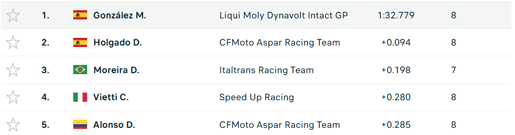 Para la Q2 David Alonso mejoró su rendimiento, a comparación de la Q1. El piloto de 19 años registró 1:33:06, selló su participación este sábado en la quinta posición y en esta misma casilla partirá este domingo cuando se realice el GP de Austria. El español Manuel González del Liqui Moly Dynavolt Intact GP fue el vencedor del día y saldrá de primero.