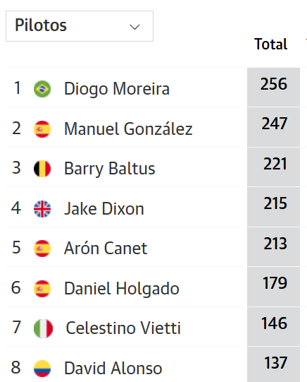 De esta forma David Alonso sigue ganando terreno en la clasificación general del Mundial de Moto 2, en su primera participación en esta categoría. El colombiano marcha octavo con 137 unidades. El escalafón lo lidera el brasilero Giogo Moreira (Italtrans Racing Team) con 256 puntos. La próxima carrera será en Algarve, Portugal el 09 de noviembre.