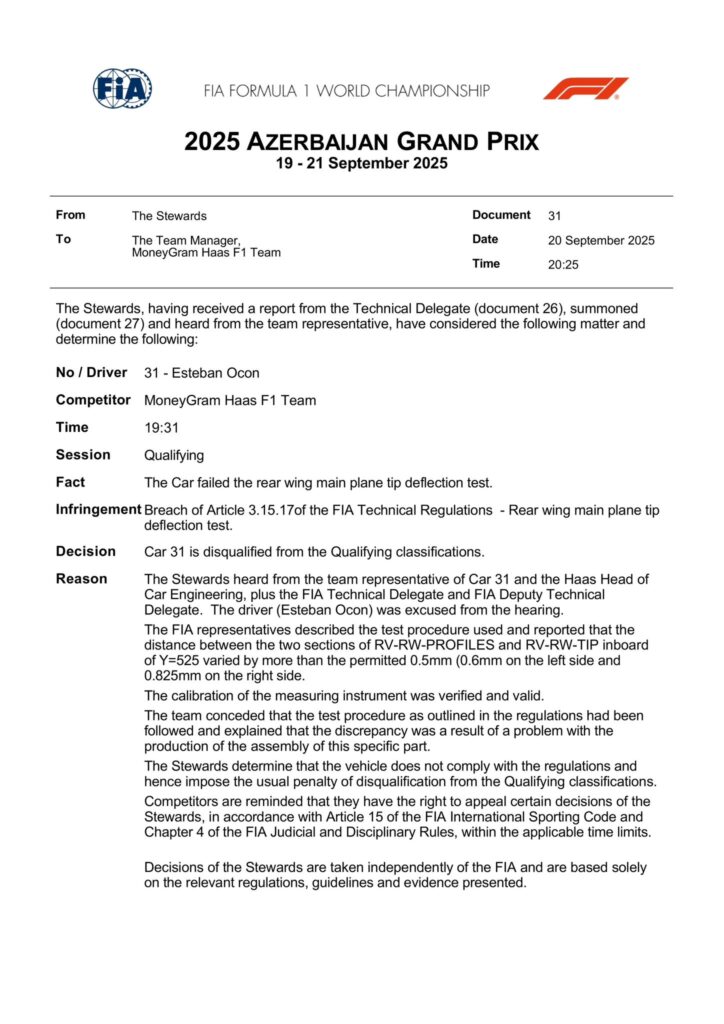 “Los comisarios escucharon al representante del equipo del coche 31 y al jefe de ingeniería de coches de Haas, así como al delegado técnico y al delegado técnico adjunto de la FIA. El piloto (Esteban Ocon) fue excusado de la audiencia. Los representantes de la FIA describieron el procedimiento de prueba utilizado e informaron que la distancia entre las dos secciones de RV-RW-PROFILES y RV-RW-TIP interior de Y=525 variaba en más de los 0,5 mm permitidos (0,6 mm en el lado izquierdo y 0,825 mm en el lado derecho). La calibración del instrumento de medición fue verificada y válida. El equipo admitió que se había seguido el procedimiento de prueba descrito en el reglamento y explicó que la discrepancia se debía a un problema con la producción del ensamblaje de esta pieza específica. Los Comisarios Deportivos determinan que el vehículo no cumple con el reglamento y, por lo tanto, imponen la sanción habitual de descalificación de las clasificaciones”, informaron los comisarios en comunicado.