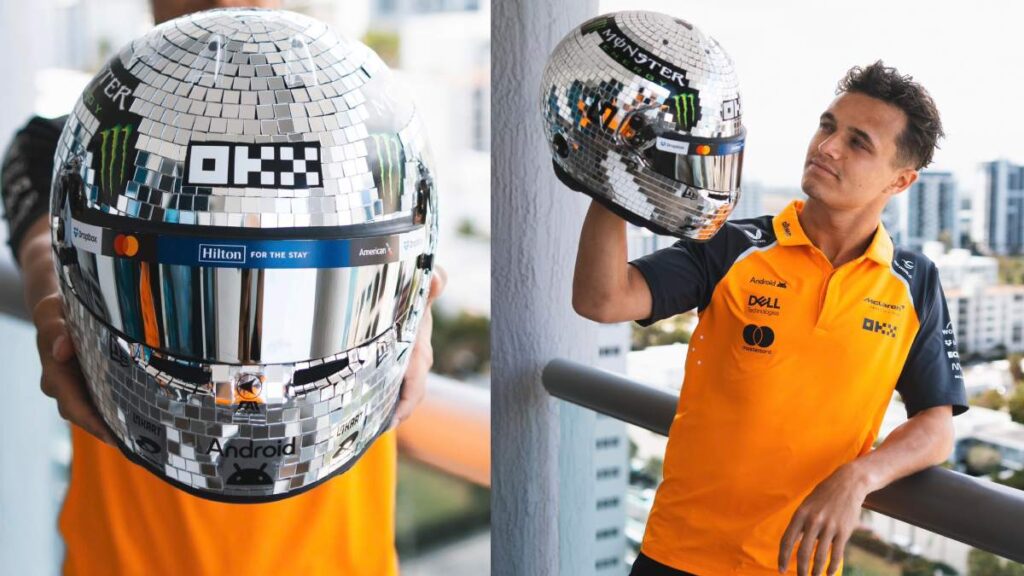 A través de redes sociales, el equipo ‘Papaya’ mostró los detalles del casco de Norris para la cita de este fin de semana que es completamente plateado con espejos que evocan las bolas de disco, un símbolo del ambiente que se vive en Miami y sobre todo, como parte de las celebraciones que vivió hace un año en el Estadio Hard Rock cuando ganó su primera carrera en la máxima categoría.