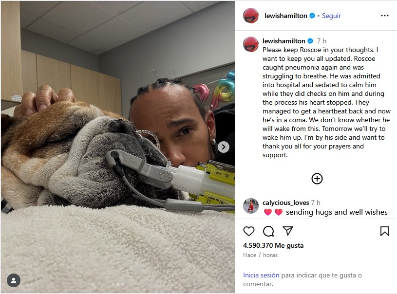 Hamilton detalló que Roscoe, de 12 años, fue sedado para realizarle una serie de estudios, sin embargo, durante el proceso su corazón se detuvo. Los médicos lograron reanimarlo, pero permanece en coma. “Consiguieron que volviera a latir y ahora está en coma. No sabemos si despertará. Mañana intentaremos despertarlo. Estoy a su lado y quiero agradecerles a todos sus oraciones y apoyo”, escribió el piloto en un mensaje acompañado de imágenes junto a su mascota.