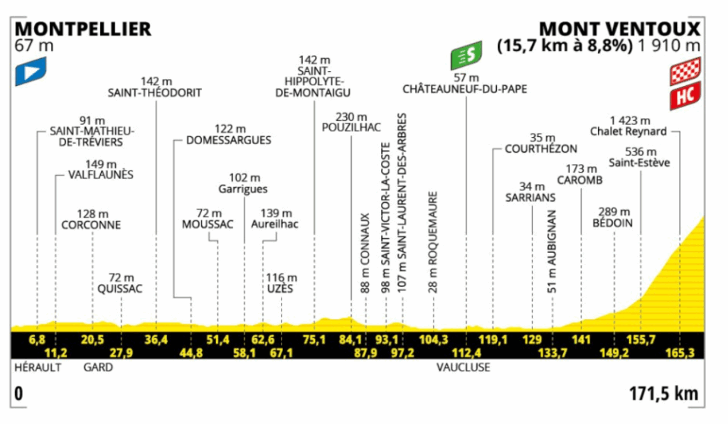 Este martes, luego de un merecido día de descanso, habrá una etapa mayormente llana, pero con cierre trepidante para una gran escalada. 171 kilómetros unirán caminos entre Montpellier y Mont Ventoux. El sprint intermedio en Chateauneuf-Du-Pape pondrá expectativa en la subida final al monte, con 15.7 kilómetros al 8.8% y a los 1.910 metros sobre el nivel del mar.