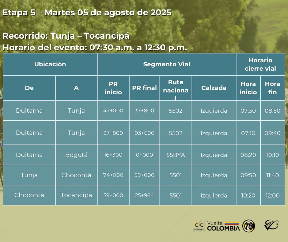 Cierres viales por la etapa 5 de la Vuelta a Colombia 2025