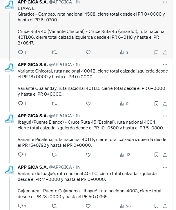 En primer lugar, teniendo en cuenta la apertura de la jornada, habrá cierres progresivos a partir de las 8 de la mañana entre la Glorieta Toreros en Mosquera y el CAI Montes de Girardot. Se recomiendan vías alternas como la de Mosquera – Facatativá – Cambao – Armero – Ibagué o Mosquera – Fusa – Melgar – Girardot.