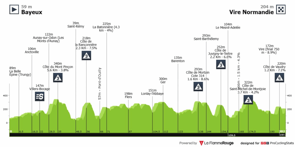 El día empezará con un sprint intermedio, pero luego habrá un puerto de montaña de tercera categoría en Cote du Mont Pincon, el descenso será muy rápido, los ciclistas tendrán que tener cuidado con las curvas. En Cote de la Ranconniére aparecerá nuevamente un puerto de montaña de tercera. Después la jornada será con planimetría de bicimontañismo.