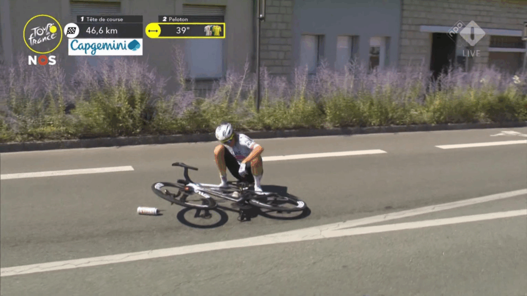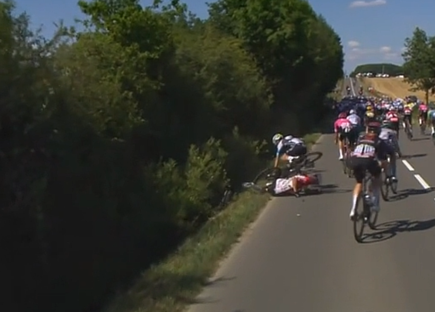 Krists Neilands se va al suelo solo, el ciclista de Letonia se levanta rápidamente y sigue su recorrido hacia la meta.