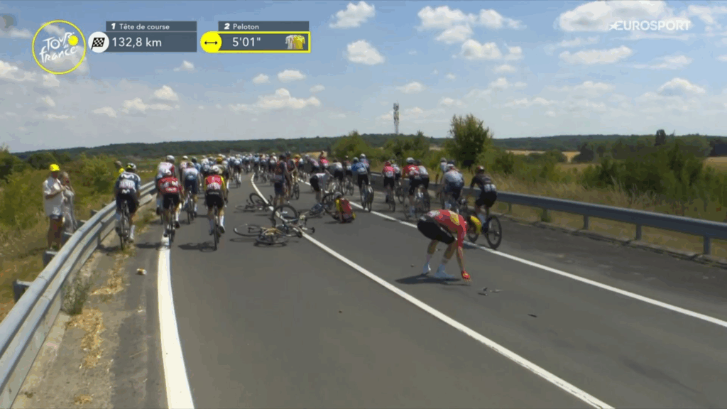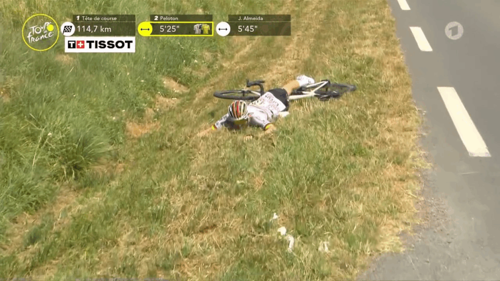 113 km | Nuevamente caída. Georg Zimmermann se va al suelo, el campeón nacional se alcanza a raspar todo su uniforme, va a necesitar un cambio de indumentaria. Tiene un par de heridas el alemán y necesita de la atención por parte de su equipo Intermarché – Wanty.