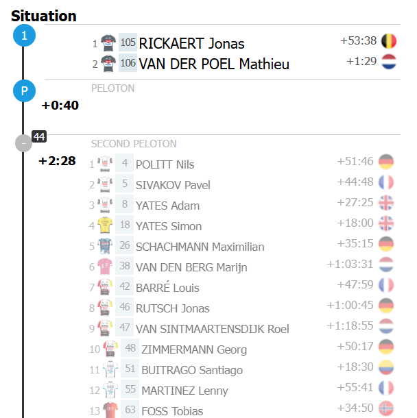 137 km | Después de haber superado el único sprint intermedio que tuvo la jornada en La Belle Indienne, la fuga se encuentra conformada por Jonas Rickaert y Mathieu van der Poel, ambos pedlistas del Alpecin – Deceuninck sacan una ventaja notable y el pelotón principal se encuentra a 4:20.
