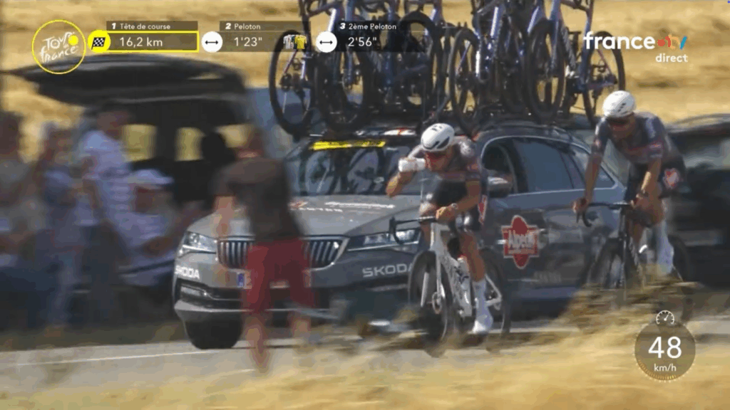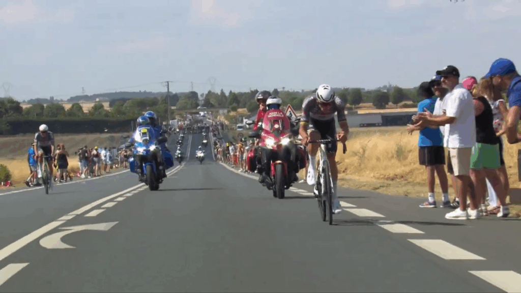 9 km | LOS QUIEREN ATRAPAAAAAAAAAAAAAAR. Jonas Rickaert y Mathieu van der Poel resisten, ambos ciclistas del Alpecin Deceuninck esperan aguantar lo que resta de la llegada a Châteauroux, sin embargo el segundo grupo ya se encuentra a 0:48. Rickaert se quedó con el premio del más combativo de la etapa 9.