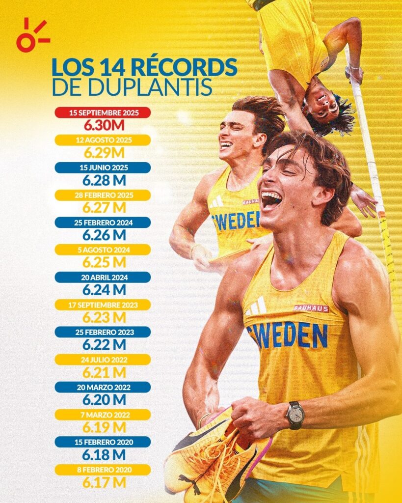 Desde su irrupción en los récords mundiales en 2020, el atleta consiguió ya 14 marcas mundiales, la primera de ellas con 6,17 metros, hoy, cinco años después la marca ha crecido 13 centímetros, consolidándose como el mejor de todos los tiempos en su disciplina y uno de los atletas más dominantes en el mundo entero.
