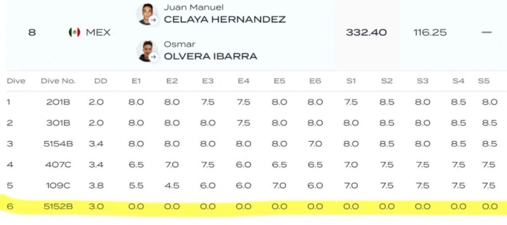 Los clavados que se realizan en una competencia tienen un código que determina los movimientos y su grado de dificultad. Antes del evento, los equipos deben entregar la lista de ejecuciones que llevarán a cabo. En el caso de Olvera y Celaya, su último intento tiene por código 5156B, un salto que han trabajado durante toda su trayectoria como dupla. Sin embargo, los jueces capturaron un código diferente en la lista: el 5152B, con una diferencia de 0.9 en el grado de dificultad.