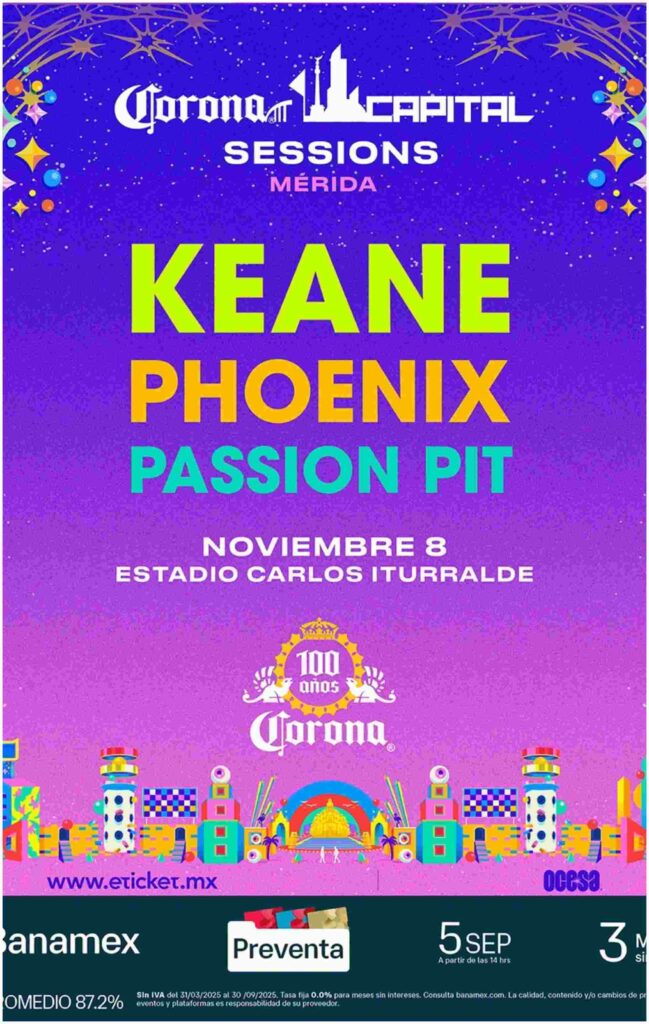 a segunda parada será en Mérida, donde se presentará el sábado 8 de noviembre de 2025 en el Estadio Carlos Iturralde, también a las 16:00 horas. En este concierto se presentarán Keane y Phoenix, quienes repiten desde la fecha de Guadalajara, además de Passion Pit, que sustituye a The Kooks en esta ciudad. Con esta programación, Mérida recibirá por primera vez una edición del Corona Capital Sessions.
