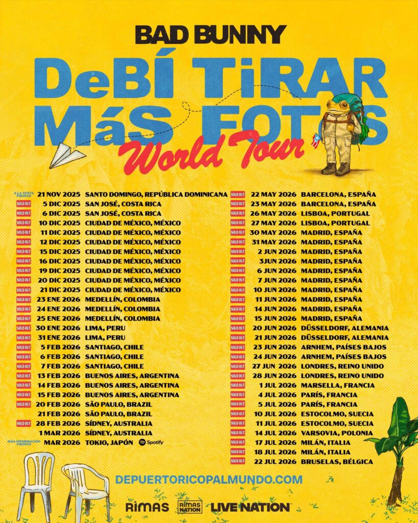 El cantante puertorriqueño Bad Bunny anunció hace algunos meses su gira “Debí tirar más fotos World Tour”, que se extenderá de noviembre de 2025 a julio de 2026 y pasará por América Latina, Europa, Asia y Oceanía. Las fechas incluyen paradas en ciudades como Santo Domingo, Ciudad de México, Medellín, Buenos Aires, Sídney, Londres y Bruselas.