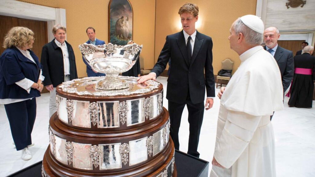 El Papa y Sinner posaron para fotos frente al trofeo de la Copa Davis que Sinner ayudó a Italia a ganar por segunda vez consecutiva el año pasado. También se exhibió en la sala el trofeo de la Copa Billie Jean King ganado por Italia en 2024, el evento más importante de equipos femeninos en el tenis.