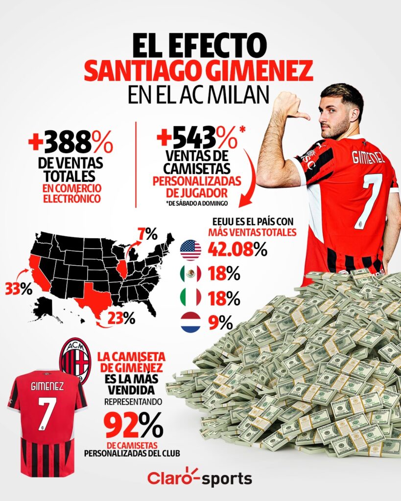 La playera de Santi Giménez causó locura en los fanáticos una vez que salió a la venta. Logró 543% más ventas de camisetas personalizadas de jugador desde el sábado al domingo. Hasta ahora, la camiseta de Giménez es la más vendida con un 92% de camisetas personalizadas del club.